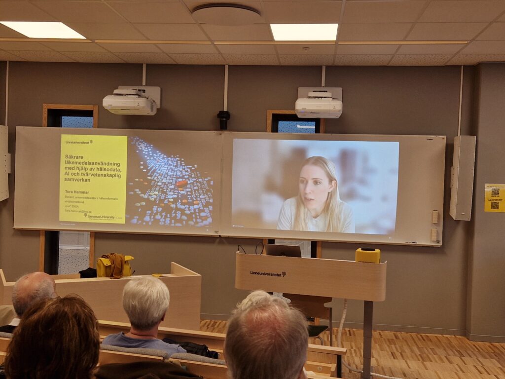 Nästa talare (via videolänk) var docent Tora Hammar som forskar och undervisar om hälsoinformatik med inriktning läkemedel. Läs gärna mer om hennes arbete i en ny artikel i tidskriften Svensk farmaci.