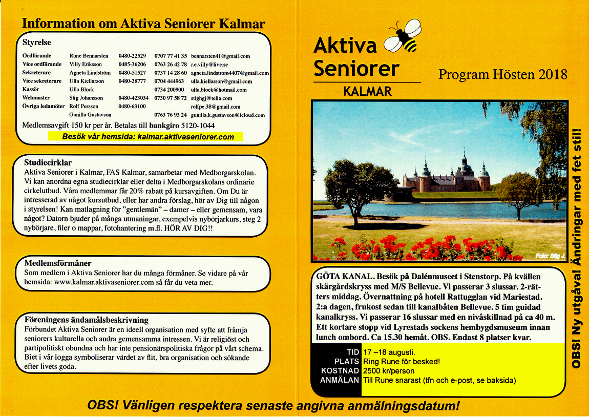 Efter den otroligt varma sommar vi har varit med om vill Styrelsen hälsa alla medlemmar välkomna till Aktiva Seniorers höstprogram.
